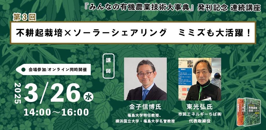 『ミミズの農業革命』(みすず書房)でおなじみ、農文協の『現代農業』2025年3月号でも大活躍の土壌生態学者・金子信博先生と、ソーラーシェアリングによる耕作放棄地再生に不耕起栽培を組み合わせた実践を展開する市民エネルギーちばの東光弘さんによるコラボ。ミミズをはじめとする生きもの、そして太陽光の力を活かしきる、これからの再生型農業とは……?