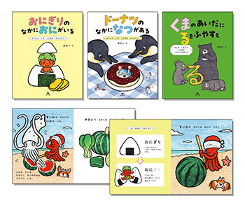 「おにぎり」という言葉の中から「おに」という言葉を見つけたり、「くま」に「る」を足して「くるま」という単語に変身させたりする(ことばあそび〉の絵本。日本語の面白さや豊かな言語感覚を育みます。