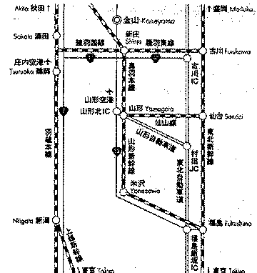 東北自動車道村田JCから山形自動車道山形北インターチェンジまで40分、国道13号で1時間40分