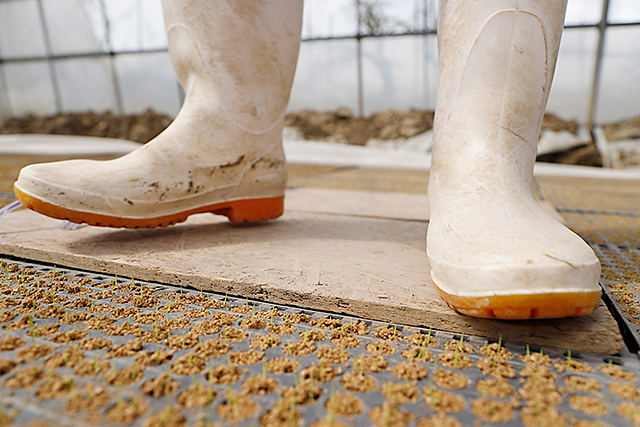 1株2〜3粒の薄播きで5.5葉のポット成苗を育てる薄井さんは、発芽力の強い大粒の種モミを使い、播きムラがないようとても気をつけている。とはいえ、出芽にはどうしても多少のムラがあるもの。その対策が、芽つぶしだ。