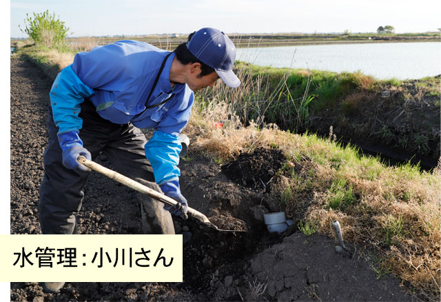 入水口の設置、代かき前・田植え前の水深設定が仕事(代かき・田植え担当も、作業直前に水深は確認)。すべての圃場間を歩き回り、1枚1枚調整する。田植え後の除草剤散布も担当