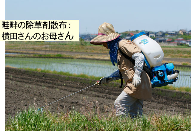 基本的にアゼの雑草対策は除草剤で。背負いの散布機を使い、生育期間中に数回散布する