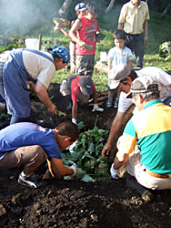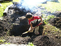 (4)石が焼けたら、鍬やシャベルで穴に焼け石を入れ、次に食材を入れ、さらに葉っぱでしっかりとフタをして、土をかぶせる。待つこと1〜2時間。この間、片付け、シャワー、あそびなど (5)シャベルや鍬で土をよけて食材を掘り出す。穴の焼け石は高熱なので、触らない。軍手は熱に弱いので、革の手袋がベスト。食材は芯から温まって、ほかほかのおいしさ子どもの感想は以下のようなものでした。