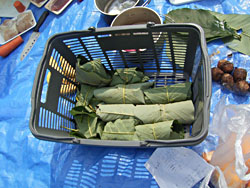 (ホウの葉、ヤマブドウの葉など:現地では、バナナの葉)・スコップ