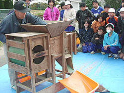 唐箕を使って籾を選別。お年寄りの実演に見入る子どもたち(写真提供 須賀川市歴史民俗資料館)