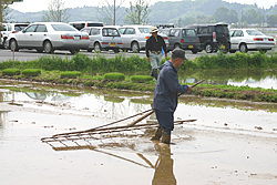 私らは田植えするのに、がじという道具で線を引きます。竹を割った棒が一二本ついていて、これをしならせながら線を引いていく(次頁)。いびつな形の田んぼで菱形にならないように縦横の線を引くのは、けっこうむずかしく、昔は決まった人の仕事でしたが、黒土の湿田だからこんなやり方だったんでしょう。私は隣町の岩瀬農業高校をでたんですが、ここではもっと原始的なやり方で、長縄植えだった。火山灰土の土では、線が消えてしまうので、両側から縄を張って田植えしたのだと思います。