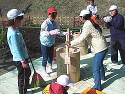 で、長沼東小では、五aの田んぼでもち米づくりをはじめた。最初は、田植えと稲刈りだけでしたが、そのときのほうがたいへんでしたね。農家はあとあとのことをイメージして段取りを組み、作業をします。まっすぐに植えないと、除草するときに田打ち車(手押しの除草機)を押せない。でも、子どもたちはそんなことおかまいなし。イネ刈りでも、刈ったらそのままほうりっぱなしの子もいる。二時間たったら、先生といっしょに学校に戻ってしまうから、一人であとしまつをするのがたいへんでした。
