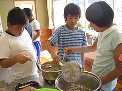 これは二〇〇六年、前任校の海陽町立宍喰小学校五年生とともに「宍喰の味てんこもりの朝ごはんを作って食べて、みんなで元気になろう」と一年間取り組んだ総合的な学習の時間の一コマである。ここでは、「みそ汁プロジェクト」で交流した徳島県阿波市立市場小学校に送ろうと、だしも手作りをめざした取り組みを中心に述べさせていただく。