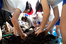 花壇に土を入れたら、子どもたちのたくさんの手でとにかくよく混ぜる!