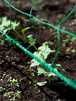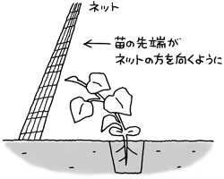 植えるときは、苗の向きに気をつける。ツルがネットにつかまりやすいよう、ツルを伸ばしている方向にネットがあるように植える。