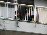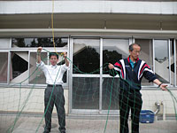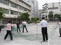 (1)たくさんの先生方が協力して、ネット張りがスタート!