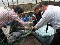 (7)ネットの端をおもり(水を入れたポリバケツ)に結び付け
