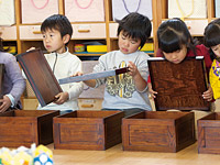 不思議そうに箱膳をのぞきこむ園児たち。3月3日、卒園を控えた年長組の園児たちが「箱膳給食」を体験した。