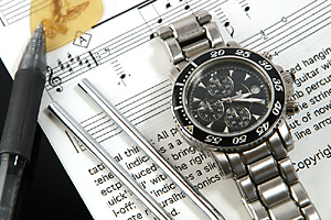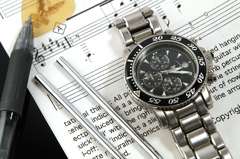 Bの条件下で時計と楽譜・音叉の組み合わせ。出番を待つミュージシャンのデスクといったイメージ。