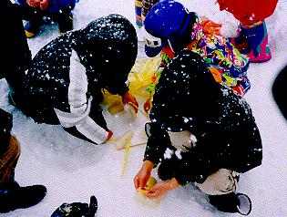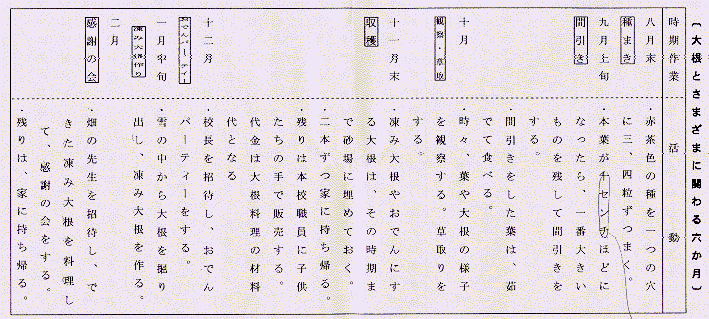 3学期が始まって間もない1月中旬、7、80センチも積もった雪と土を掘り起こし、埋めておいた大根四10本を掘り出す。埋めたところがわからなくなり、わいわいと大騒ぎ。みんなで洗い、凍らないようにして乾かしておく。翌日、畑の先生に教えてもらいながら、皮をむき、適当な大きさに切る。外に竈と鍋を用意し、薪を燃やして湯を沸かし、大根を茹でる。茹であがった大根は、箸で穴をあけ、わらを通す。2つの大根のわらとわらを結び、竿に掛ける。1、2年生の子供たちには、「結ぶ」という作業がなかなか難しいが、全部の大根を干し終わる頃には、とても上手になる。