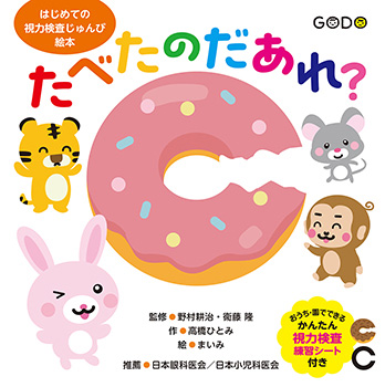 この絵本は「視力検査をスムーズに受けられる」ために考案されたものです。子どもにはなじみのない「ランドルト環」を、みんなが大好きな「ドーナツ」に見立てて、「切れ目」を当てるクイズにしています。