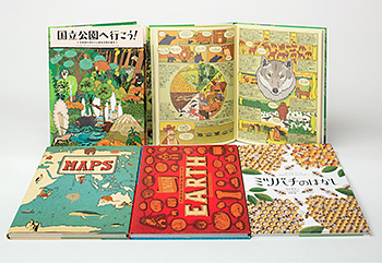 42の国と地域を紹介する『マップス』や、地面の下・水の中の世界を紹介した『アンダーアース・アンダーウォーター』、ミツバチの全てを伝える『ミツバチのはなし』など、楽しく学べる大判絵本セット。