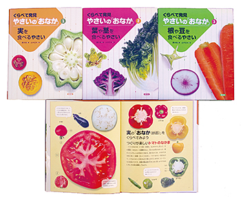 ●で表示されているシリーズ名をクリックすると、内容をご覧いただけます。 くらべて発見 やさいの「おなか」 全3巻